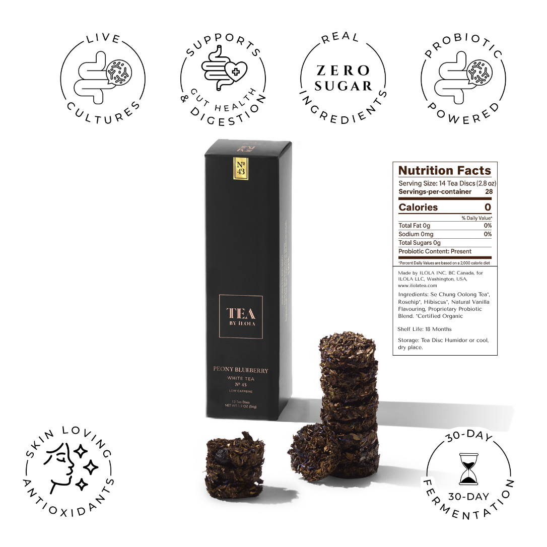 GLOW + DIGESTION | PROBIOTIC WHITE TEA DISCS | LIGHT CAFFEINE Peony Blueberry No. 43 is a soft and subtly sweet white tea crafted with Bai Mudan, juicy blueberry, and vibrant cornflower petals. T...