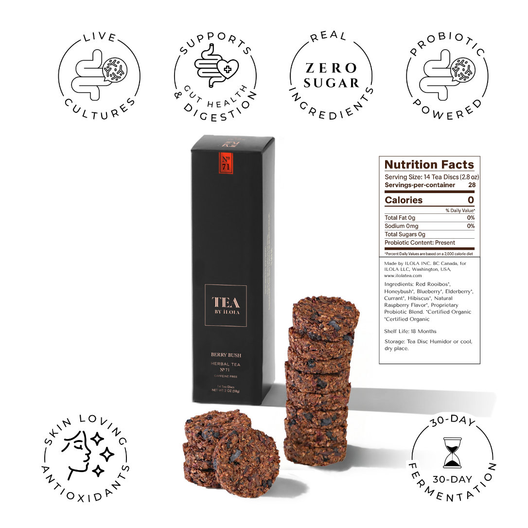 IMMUNE SUPPORT | PROBIOTIC LOOSE LEAF TEA DISCS | CAFFEINE-FREE | ZERO SUGAR A vibrant blend for immunity and balance. Berry Bush No. 71 features antioxidant-rich red rooibos, sweet honeybush, and ...