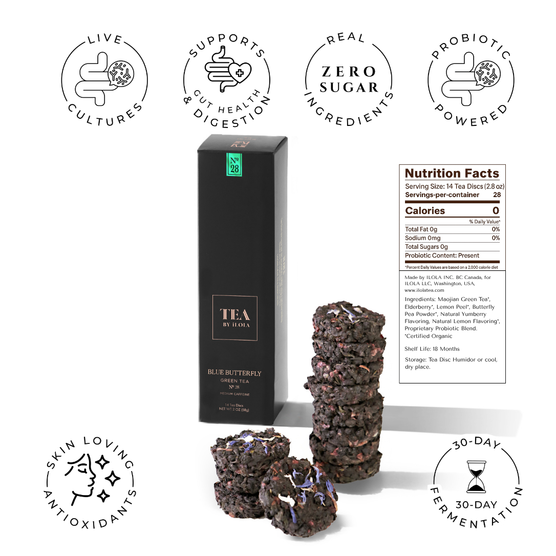 A stunning green tea blend that brews blue, turns purple with lemon, and delights with elderberry, citrus, and butterfly pea flower. Smooth, tart, and probiotic-rich.